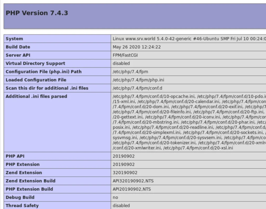 에 접속하여 PHP 정보 페이지가 표시되는지 확인합니다. 표시된다면 PHP와 Nginx가 올바르게 연동된 것입니다.